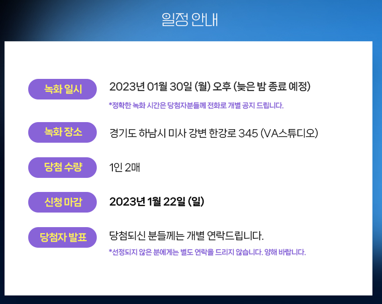 메들리 방청단은 아래의 일정에 따라 모집되고 있습니다.