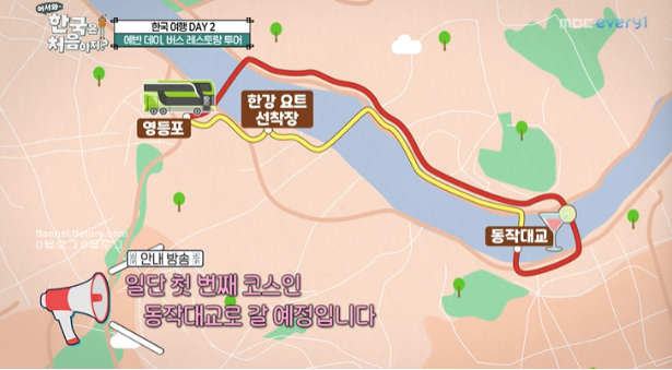 투어의 시작인 버스가 출발하면서 시작되는데요. 통유리 창문을 통해 서울의 야경을 마음껏 바라볼 수 있습니다. 영등포에서 출발한 버스가 동작대교를 돌아가면서 한강요트 선착장을 통해 처음 영등포로 돌아오게 되는데요. 다리위에서 바라보는 석양과 요트 선착장에서 바라보는 야경의 아름다움을 한껏 느낄 수 있는 루트입니다.