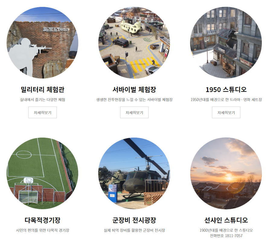 개화기의 한성의 모습을 구경할 수 있는 곳이기도 한 논산의 션샤인랜드는 다양한 체험할 거리를 제공하고 있는데요. 실내에서 즐기는 밀리터리 체험관, 생생한 전투의 현장을 느낄 수 있는 서바이벌 체험관, 1950년대를 바탕으로 한 드라마 영화 세트장인 1950 스튜디오, 다목적경기장, 군장비 전시광장, 마지막으로 1900년대를 배경으로 한 션샤인 스튜디오까지 다양한 체험을 할 수 있으니 가게 되시면 체험해보시는 것을 추천드립니다.