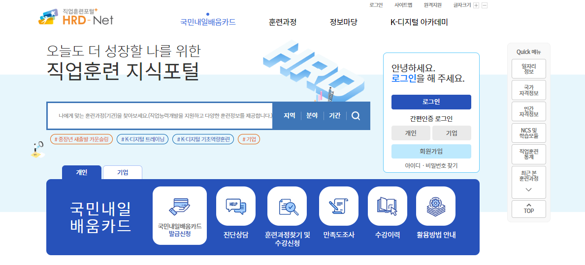 내일배움카드는 직업훈련지식포털(hrd.go.kr)에서 신청 가능합니다.