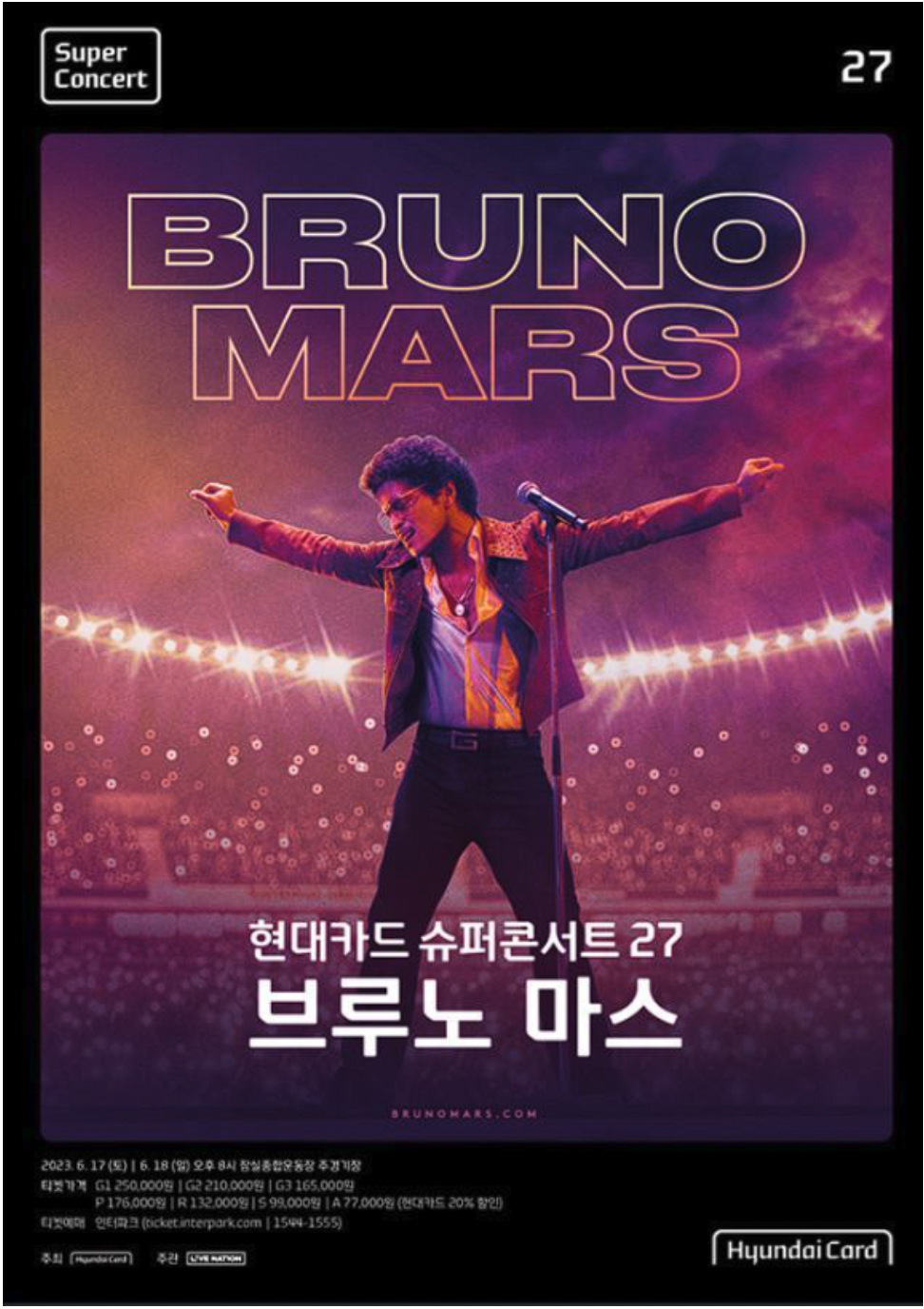 최고의 가수라고 불리우는 팝스타 브루노마스가 6월 17~18일에 내한 공연을 연다고 하는데요. 현대카드에서 운영하는 자사콘서트 브랜드 슈퍼콘서트의 27번째 행사 콘서트라고 하는데요. 그래서 이번시간에는 브루노마스 내한 콘서트의 공연정보와 티켓구매방법, 예매 페이지 등 다양한 정보에 대해 알아보도록 하겠습니다.