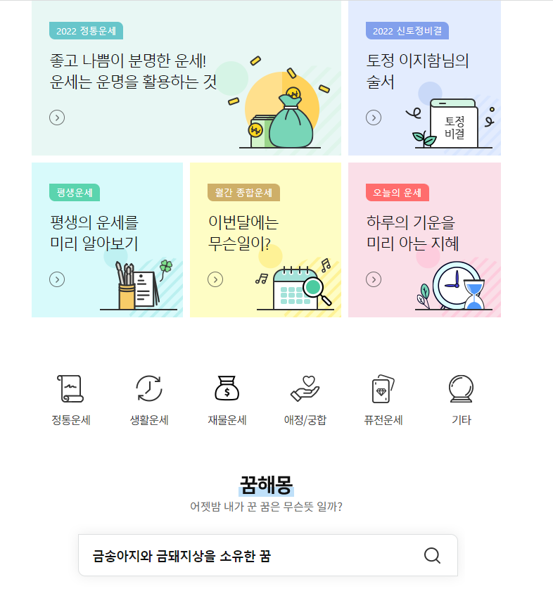 전통 운세, 평생 운세, 종합 운세 등 다양한 운세에 대해 제공하고 있습니다.