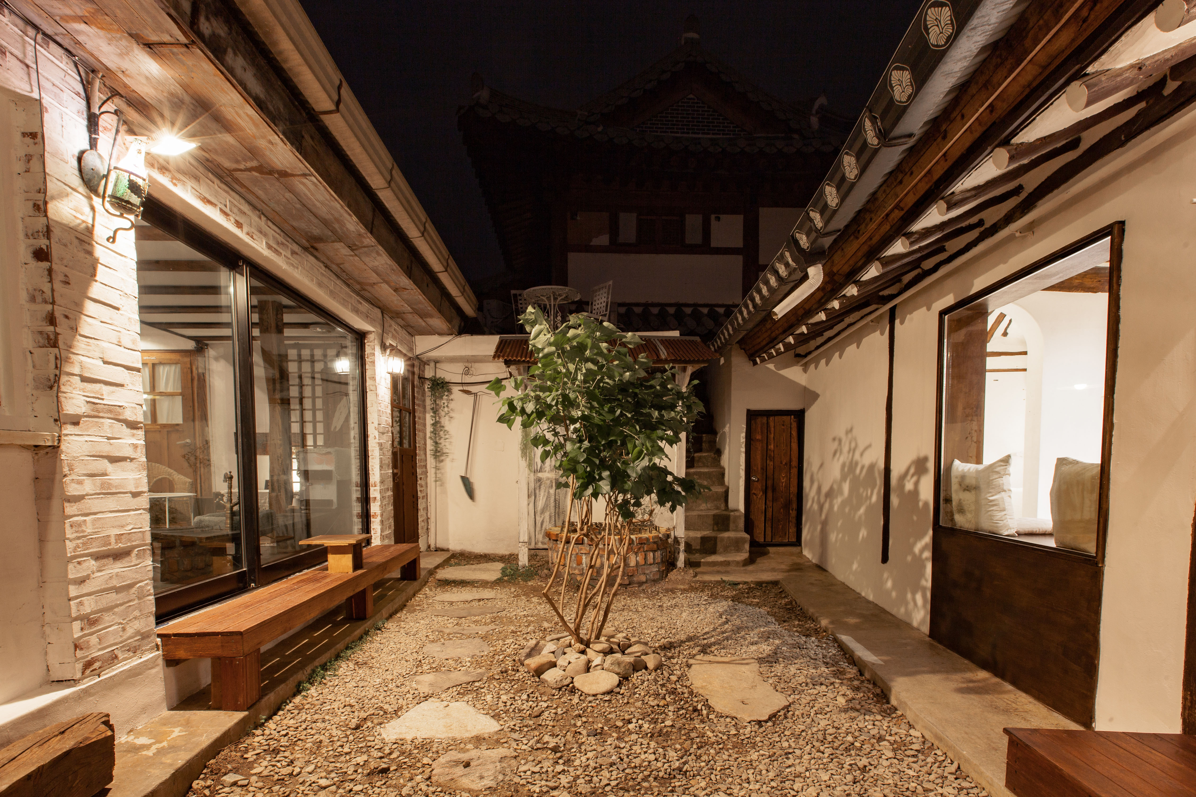 자깔이 깔린 마당과 침실에 보이는 창은